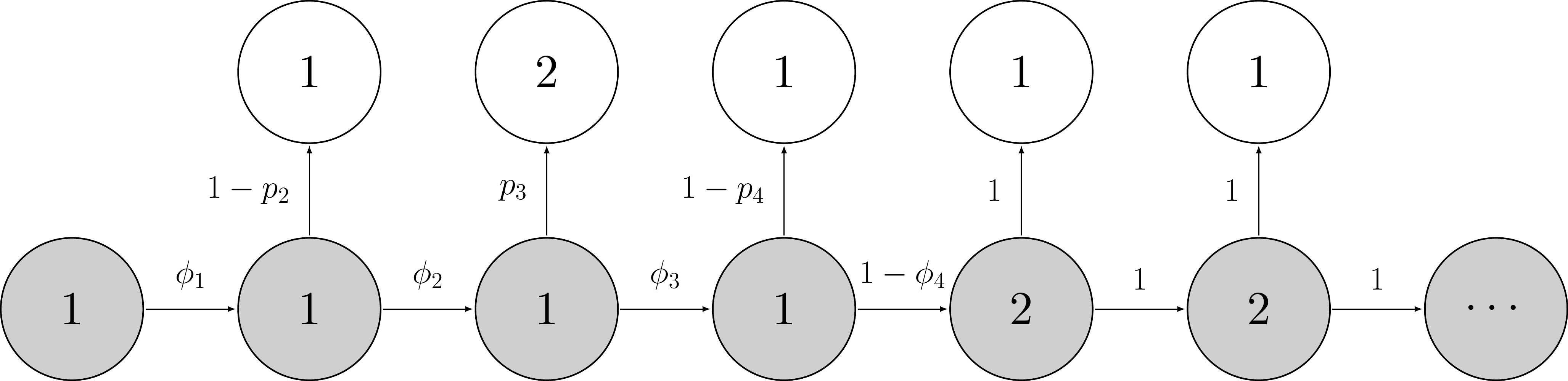 Note that the states (in gray) and the observations (in white) do not change. We still have \(z = 1\) for alive, \(z = 2\) for dead, \(y = 1\) for non-detected, and \(y = 2\) for detected.