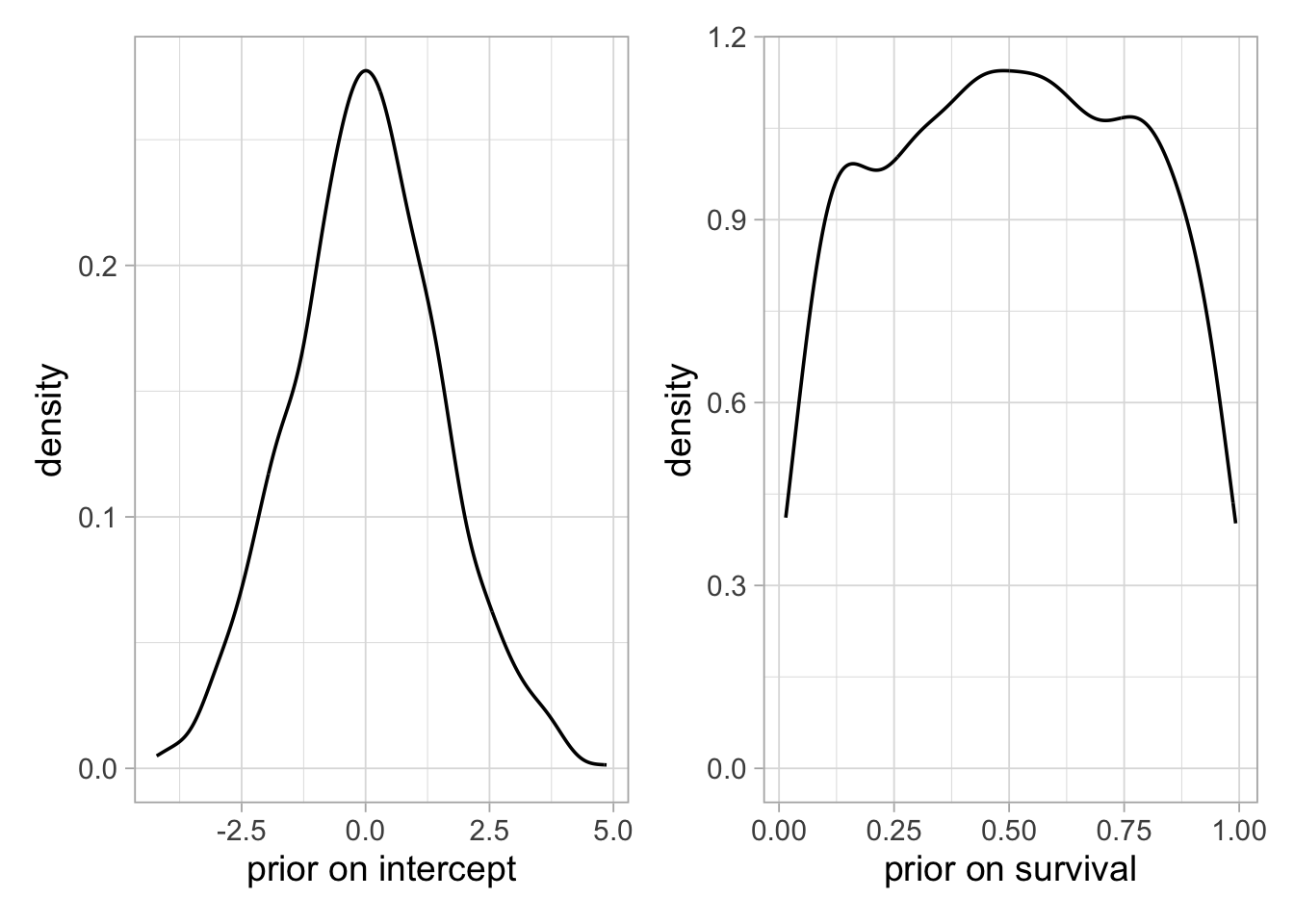The prior phi ~ dnorm(0.57, sd = 0.073) is not entirely satisfying because it is not constrained to be positive or less than one, which is the minimum for a probability (of survival) to be well defined. In our specific example, the prior distribution is centered on positive values far from 0, and the standard deviation is small enough so that the chances to get values smaller than 0 or higher than 1 are null (to convince yourself, just type in hist(rnorm(1000, mean = 0.57, sd = 0.073)) in R). Can we do better? The answer is yes.