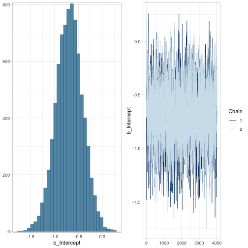 class: center, middle, title-slide .title[ # Quick intro to brms ] .author[ ### Olivier Gimenez ] .date[ ### last updated: 2025-11-11 ] --- class: middle center background-color: black  --- # What is brms? -- + Developed by [Paul-Christian Bürkner](https://paul-buerkner.github.io/). -- + In brief, `brms` allows fitting GLMMs (but not only) in a `lme4`-like syntax within the Bayesian framework and MCMC methods with `Stan`. -- + I'm not a `Stan` user, but it doesn't matter. -- + The [vignettes](https://paul-buerkner.github.io/brms/articles/) are great to get you started. I also recommend the [list of blog posts about `brms`](https://paul-buerkner.github.io/blog/brms-blogposts/). -- + Nice alternative to `NIMBLE` if you do not need to code your models. --- # Example Say we capture, mark and release `\(n = 57\)` animals at the beginning of a winter, out of which we recapture `\(y = 19\)` animals alive: ``` r dat <- data.frame(alive = 19, # nb of success total = 57) # nb of attempts dat ``` ``` alive total 1 19 57 ``` --- # Example Assuming all animals are independent of each other and have the same survival probability `\(\theta\)`, then `\(y\)` the number of alive animals at the end of the winter is binomial. Using a uniform prior for survival, we have: `\begin{align*} y &\sim \text{Binomial}(n, \theta) &\text{[likelihood]} \\ \theta &\sim \text{Uniform}(0, 1) &\text{[prior for }\theta \text{]} \\ \end{align*}` We'd like to estimate winter survival `\(\theta\)`. An obvious estimate of the probability of a binomial is the proportion of cases, `\(19/57 = 0.3333333\)`. --- # Maximum-likelihood estimation To get an estimate of survival, we fit a logistic regression using the `glm()` function. The data are grouped (or aggregated), so we need to specify the number of alive and dead individuals as a two-column matrix on the left hand side of the model formula: ``` r mle <- glm(cbind(alive, total - alive) ~ 1, family = binomial("logit"), # family = binomial("identity") would be more straightforward data = dat) ``` --- # Maximum-likelihood estimation On the logit scale, survival is estimated at: ``` r coef(mle) # logit scale ``` ``` (Intercept) -0.6931472 ``` --- # Maximum-likelihood estimation After back-transformation using the reciprocal logit, we obtain: ``` r plogis(coef(mle)) ``` ``` (Intercept) 0.3333333 ``` --- # Bayesian analysis with `NIMBLE` + See previous section. --- # Bayesian analysis with `brms` In `brms`, you write: ``` r library(brms) bayes.brms <- brm(alive | trials(total) ~ 1, family = binomial("logit"), # binomial("identity") would be more straightforward data = dat, chains = 2, # nb of chains iter = 5000, # nb of iterations, including burnin warmup = 1000, # burnin thin = 1) # thinning ``` --- # Display results ``` r bayes.brms ``` --- # Display results ``` Family: binomial Links: mu = logit Formula: alive | trials(total) ~ 1 Data: dat (Number of observations: 1) Draws: 2 chains, each with iter = 5000; warmup = 1000; thin = 1; total post-warmup draws = 8000 Regression Coefficients: Estimate Est.Error l-95% CI u-95% CI Rhat Bulk_ESS Tail_ESS Intercept -0.69 0.28 -1.24 -0.16 1.00 2282 3729 Draws were sampled using sampling(NUTS). For each parameter, Bulk_ESS and Tail_ESS are effective sample size measures, and Rhat is the potential scale reduction factor on split chains (at convergence, Rhat = 1). ``` --- # Visualize results ``` r plot(bayes.brms) ``` --- # Visualize results <!-- --> --- # Working with MCMC draws To get survival on the `\([0,1]\)` scale, we extract the MCMC values, then apply the reciprocal logit function to each of these values, and summarize its posterior distribution: ``` r library(posterior) draws_fit <- as_draws_matrix(bayes.brms) draws_fit summarize_draws(plogis(draws_fit[,1])) ``` --- # Working with MCMC draws ``` # A draws_matrix: 4000 iterations, 2 chains, and 4 variables variable draw b_Intercept Intercept lprior lp__ 1 -0.52 -0.52 -1.9 -4.3 2 -0.42 -0.42 -1.9 -4.6 3 -1.06 -1.06 -2.0 -5.1 4 -1.22 -1.22 -2.1 -5.9 5 -1.30 -1.30 -2.1 -6.5 6 -1.48 -1.48 -2.1 -7.9 7 -0.99 -0.99 -2.0 -4.7 8 -0.66 -0.66 -2.0 -4.2 9 -0.67 -0.67 -2.0 -4.2 10 -0.58 -0.58 -2.0 -4.2 # ... with 7990 more draws ``` --- # Working with MCMC draws | b_Intercept| Intercept| lprior| lp__| |-----------:|----------:|---------:|---------:| | -0.5155660| -0.5155660| -1.945333| -4.342353| | -0.4180417| -0.4180417| -1.935734| -4.622156| | -1.0649858| -1.0649858| -2.034642| -5.064739| | -1.2242548| -1.2242548| -2.070983| -5.934109| | -1.3022845| -1.3022845| -2.090361| -6.455621| | -1.4814553| -1.4814553| -2.138564| -7.873306| | -0.9884074| -0.9884074| -2.018763| -4.745120| | -0.6588612| -0.6588612| -1.962955| -4.163971| | -0.6698501| -0.6698501| -1.964477| -4.161465| | -0.5781860| -0.5781860| -1.952524| -4.230805| --- # Working with MCMC draws To get survival on the `\([0,1]\)` scale, we extract the MCMC values, then apply the reciprocal logit function to each of these values. Then summarize its posterior distribution: ``` r library(posterior) draws_fit <- as_draws_matrix(bayes.brms) draws_fit summarize_draws(plogis(draws_fit[,1])) ``` --- # Working with MCMC draws ``` # A tibble: 1 × 10 variable mean median sd mad q5 q95 rhat ess_bulk ess_tail <chr> <dbl> <dbl> <dbl> <dbl> <dbl> <dbl> <dbl> <dbl> <dbl> 1 b_Intercept 0.336 0.334 0.0609 0.0611 0.240 0.441 1.00 2282. 3729. ``` --- # What is the prior used by default? ``` r prior_summary(bayes.brms) ``` ``` Intercept ~ student_t(3, 0, 2.5) ``` --- # What if I want to use a different prior instead? ``` r nlprior <- prior(normal(0, 1.5), class = "Intercept") # new prior bayes.brms <- brm(alive | trials(total) ~ 1, family = binomial("logit"), data = dat, prior = nlprior, # set prior by hand chains = 2, # nb of chains iter = 5000, # nb of iterations, including burnin warmup = 1000, # burnin thin = 1) ``` --- # Priors Double-check the prior that was used: ``` r prior_summary(bayes.brms) ``` ``` Intercept ~ normal(0, 1.5) ```